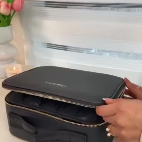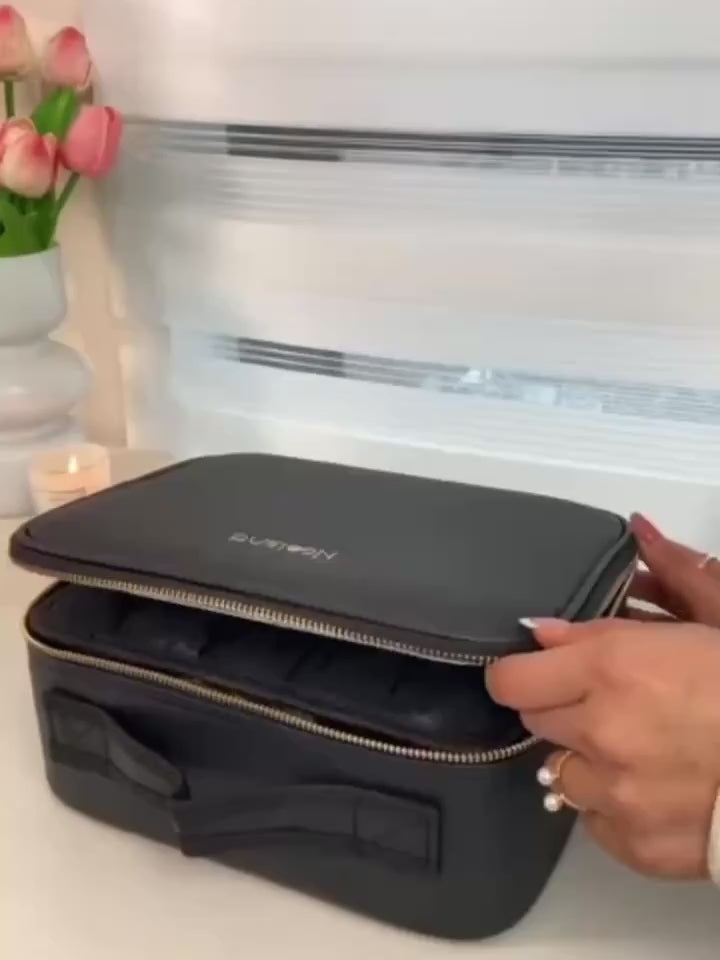 This makeup travel bag combines functionality and convenience, featuring an LED lighted mirror with adjustable brightness to ensure perfect makeup application anywhere. Its portable design includes adjustable dividers, allowing customized storage for brushes, accessories, and tools. Ideal for professionals and enthusiasts alike, this makeup case keeps your essentials organized and ready to go on the move.